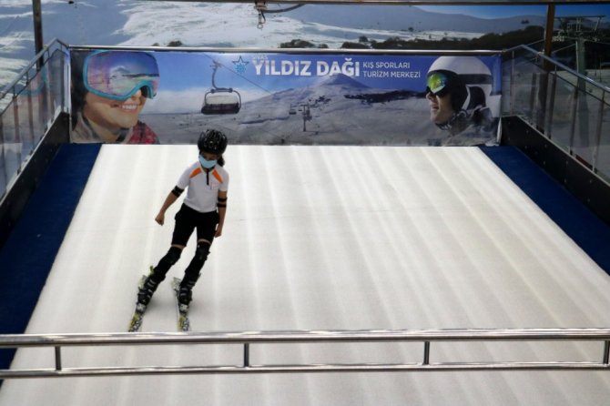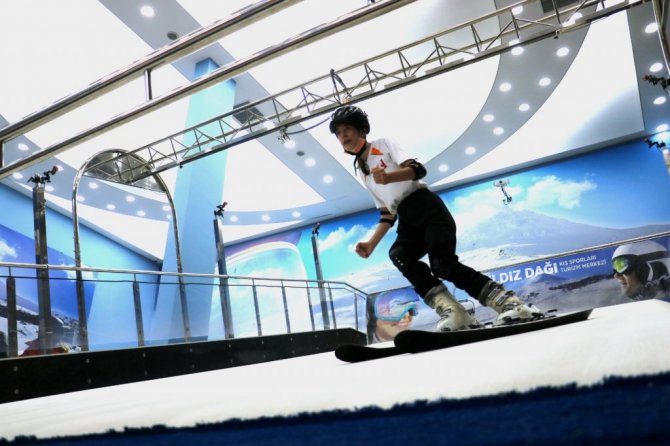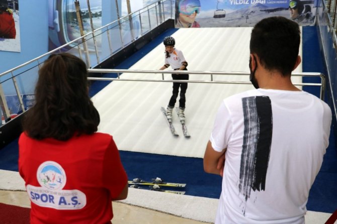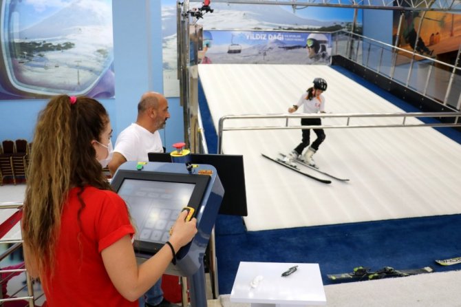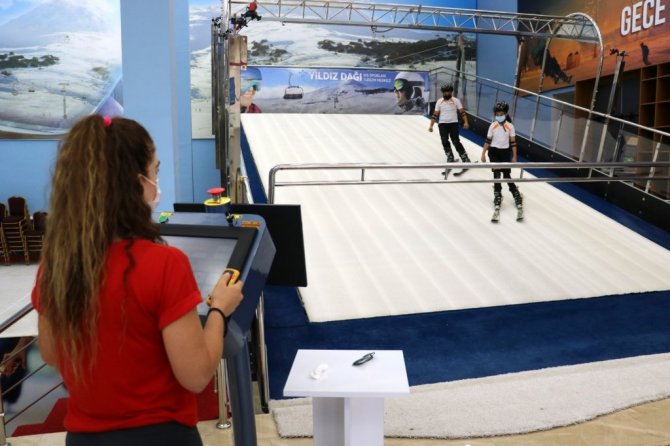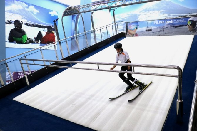 Sivas'ta Türkiye'nin ilk kayak simülasyon merkezi olan Kış Sporları Eğitim Merkezi'nde sporcular ve vatandaşlar sıcak havaya rağmen kayak yapmanın keyfini doyasıya çıkarıyor.
