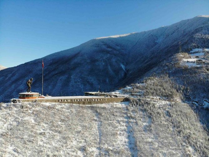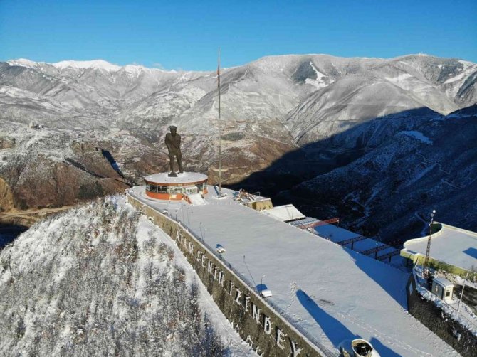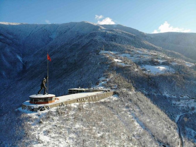 Artvin'de, 22 Metre yüksekliği ve 50 ton ağırlığındaki Türkiye'nin en büyük Atatürk heykelinin bulunduğu Atatepe'nin beyaza bürünmüş hali havadan görüntülendi.