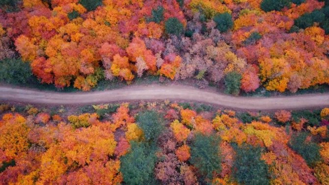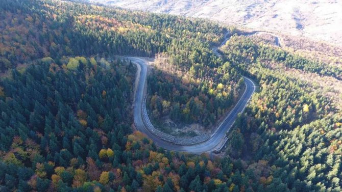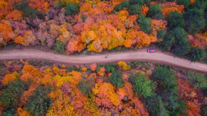 Dünya Doğayı Koruma Vakfı tarafından acil olarak korunması gereken 100 sıcak noktadan biri olarak gösterilen Karabük ormanlarında, kasım ayında sonbahar güzelliğini göstermeye başladı. Dünyada çok az ormanda görülebilecek kadar çok sayıda ağaç, bitki ve hayvan türünü barındıran orman ekosistemine sahip olan bölge, her mevsim ayrı bir güzelliğe bürünüyor. İlkbahar ve yaz boyunca dağların üzerini kaplayan yeşil örtü, sonbaharın gelmesiyle yerini sarı ve kırmızı tonlara bırakıyor. Farklı renklerin bir araya gelip oluşturduğu eşsiz manzara, drone ile havadan görüntülendi. Doğa tutkunlarına da keyifli bir zaman yaşatan Karabük ormanları, eşsiz güzelliği ile insanları mest ediyor.