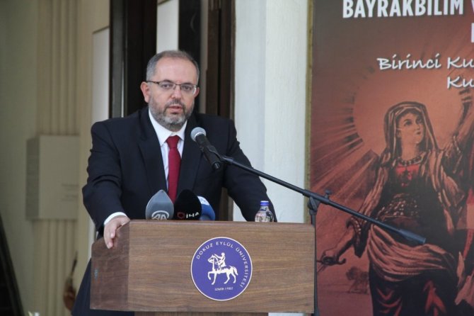 Kürsüde konuşan Milli Savunma Üniversitesi Rektörü Prof. Dr. Erhan Afyoncui al bayrağımızın tarihimizin devamlılığının göstergesi olduğuna dikkat çekti. Prof. Dr. Afyoncu, "Bayrağın bizim için önemini belirtmeye gerek yok. Bu milletin 2bin 200 yıllık sembolü olmuş, uğruna can verilmiş, bağımsızlığını bayrakla simgelemiş bir milletiz. Türkler'in çok eski dönemden beri bayrak ve sancakları var. Bunların tabi tek bir bayrağa indirgenmesi uzun bir süreç. Burada ilginç bir husus var; bugün kullandığımız, şerefimiz olan al bayrak bize Osmanlı'dan miras. Devletimizin devamlılığında da en büyük göstergelerinden biri. Ay yıldızlı bayrağımızın izine 15'inci yüz yıldan itibaren rastlıyoruz. 17'inci yüz yılın sonlarında birçok kalede ay yıldızlı bayrak çekili olduğunu görüyoruz. Bizi şan ve şerefle temsil ediyor. Bayrağımız aynı zamanda tarihimizin de devamlılığını göstermektedir" açıklamasında bulundu.