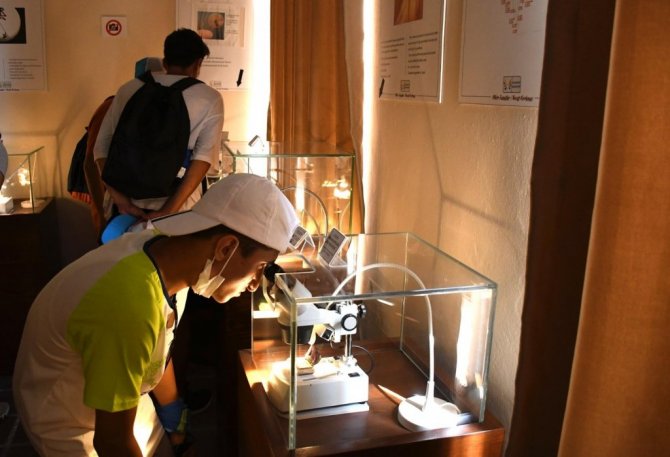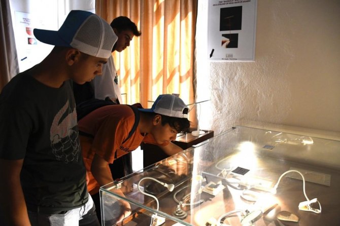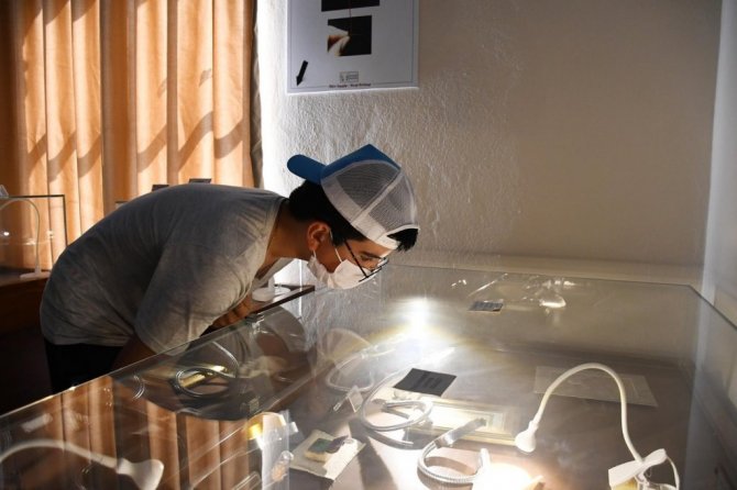 Öğrenciler, Türkiye'nin tek mikro minyatür sanatçısı Necati Korkmaz'ın mikro minyatür çalışmalarına hayran kaldı.