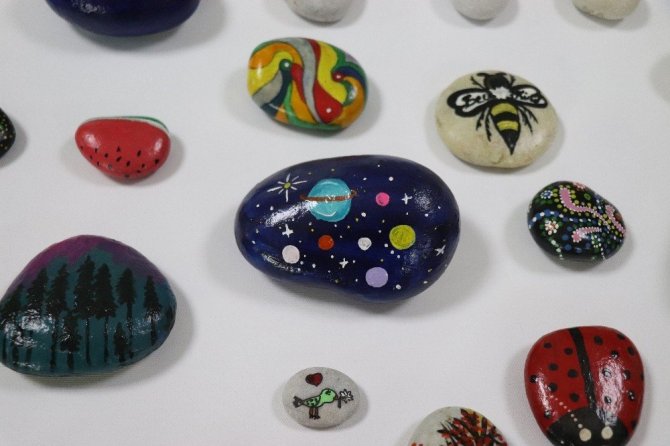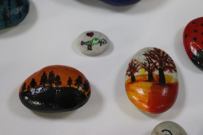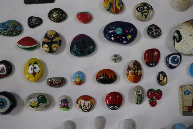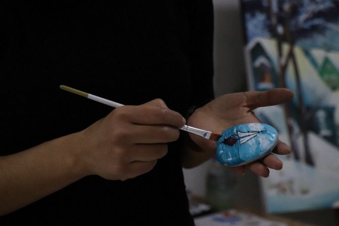 Tuvalde gördüğü resimleri minik doğal taşlar üzerine nakşetti