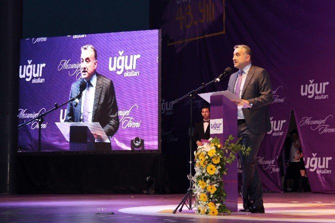 Mezuniyet töreni, öğrencilerin “Uğurlu olmak nedir?” başlıklı sunumu ile başlarken, Bornova ve Gaziemir Uğur Lisesi’nin zeybek gösterileri ile devam etti. Ardından Uğur Okulları Genel Müdürü Yücel Yücel bir konuşma yaptı. Yücel, kendisinin de Uğur Okulları’ndan mezun olduğunu belirterek, “Öğrencilerimizin az önce ‘Uğurlu olmak nedir?’ sorusuna cevap verdikleri görüntülerini izledik. Bana göre Uğurlu olmak, bundan 21 sene önce gittiğim kuruma genel müdür olmaktı. Bu hayalimi gerçekleştirdim. Uğurlu olmak, öz güven sahibi, kendi ayakları üzerinde duran öğrenci olmaktır. Bir dünya vatandaşı olabilmektir. Bugün duyduğunuz heyecanı, aşacağınız yeni hedefler, kazanacağınız yeni arkadaşlıkların ve başarıların başlangıcı olarak görüyoruz. Bugün hem mutlu, hem umutlu hem de duyguluyuz” dedi.