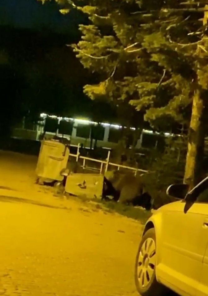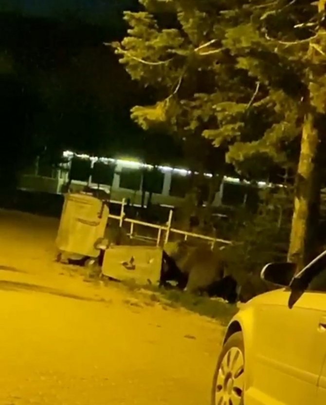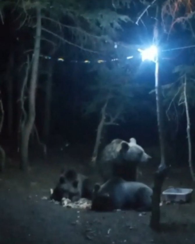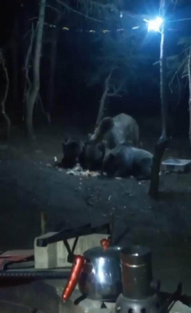 Uludağ'da ormandan yerleşim yeri olarak bilinen Sarıalan Bölgesi'ne gelen anne ayı ve 3 yavrusu; kendileri için bırakılan ekmekleri ve yemekleri yerken görüntülendi. Bir kampçı tarafından görüntülenen ayılar, kaptan su içiyor ve iştahla yemekleri yiyor.