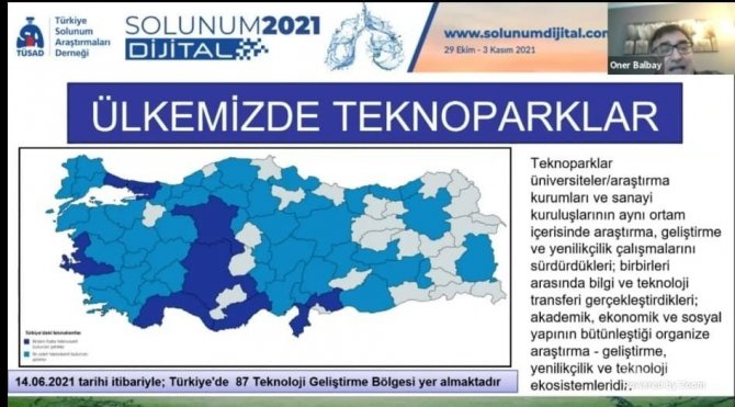 Türkiye Solunum Araştırmaları Derneği (TÜSAD) tarafından her yıl yapılan yıllık solunum kongresi pandemi sebebiyle bu yıl online ortamda gerçekleştirildi. "Solunum2021 Dijital" olarak yapılan kongreye, ulusal ve uluslararası göğüs hastalıkları alanında önde gelen isimlerin yanı sıra çok sayıda dinleyici katıldı. 29 Ekim- 3 Kasım tarihleri arasında devam eden kongrenin 3. gününde Düzce Üniversitesi Tıp Fakültesi Araştırma ve Uygulama Hastanesi Başhekimi Prof. Dr. Öner Abidin Balbay, göğüs hastalıklarında maliyet analizleri ve araştırma fonları konulu konferansa başkanlık yaptı. Prof. Dr. Balbay, katılımcılara ayrıca Türkiye ve dünyaya rol model olan üniversite-sanayi işbirliğini de anlattı. Çeşitli örnekler vererek modelin işleyişi hakkında katılımcılara bilgiler veren Prof. Dr. Öner Abidin Balbay, üniversite ile sanayi kuruluşlarının işbirliği içinde yaptığı çalışmalarda alınan başarılı sonuçları da aktardı.
