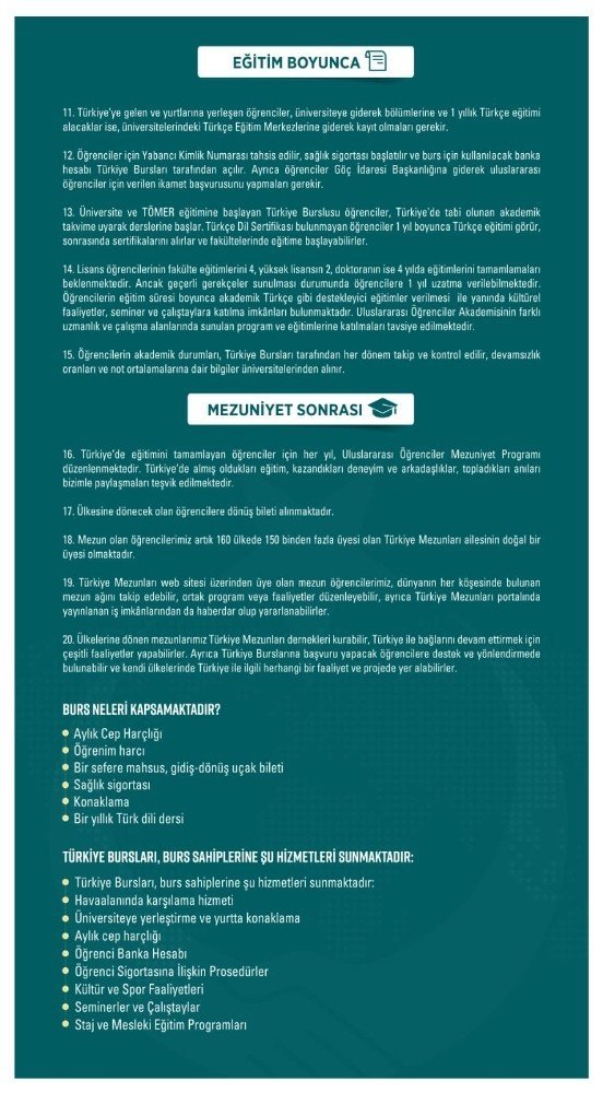 Türkiye’ye gelen öğrencilere ilk 1 yıl boyunca Türkçe eğitimi veriliyor. Daha sonra öğrenciler tercihleri doğrultusunda üniversite eğitimlerine başlıyor. Türkiye Bursları, lisans, yüksek lisans, doktora ve araştırma burslarını kapsıyor. Türkiye Bursları kapsamında öğrencilerin okul harçları ve barınma ücretlerinin yanında aylık cep harçlıkları da devlet tarafından veriliyor. Öğrencilerin Türkiye’ye ilk geliş ve mezun olduktan sonra ülkelerine dönüş biletleri YTB tarafından karşılanırken, Türkiye’de kaldıkları süre boyunca sağlık sigortası primleri de ödeniyor.