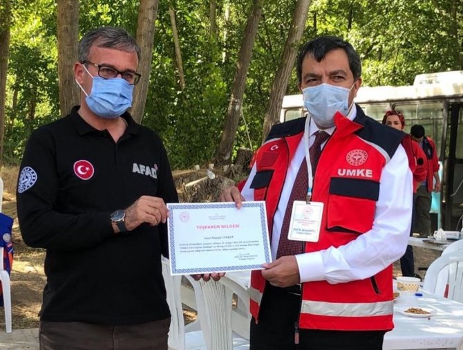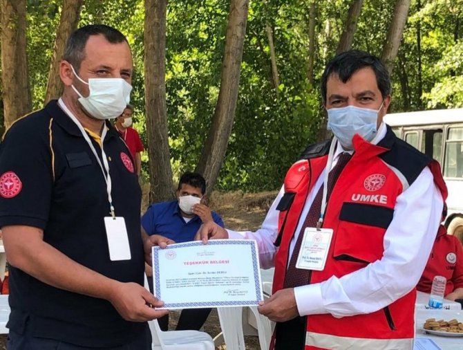 İl Acil Afet Durum Müdürlüğü personellerinin de destek verdiği UMKE Temel Eğitim Tatbikatı'na katılarak eğitimi tamamlayan sağlık çalışanlarına teşekkür belgelerini veren