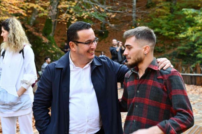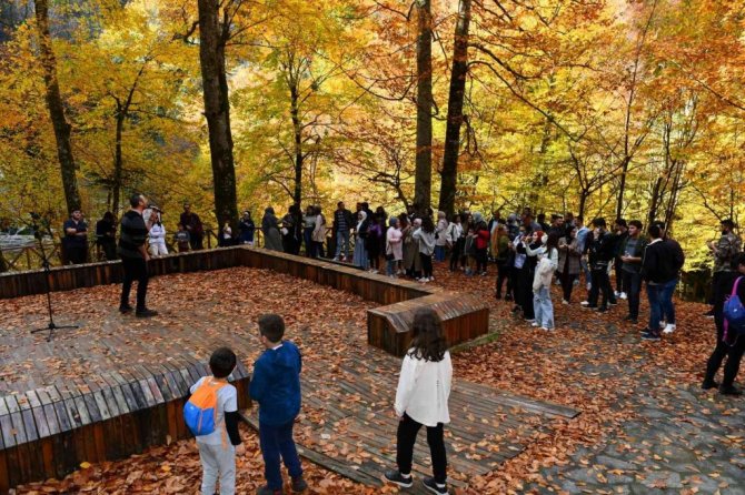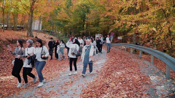 38 metre yükseklikten dökülen şelaleyi ve göz kamaştıran eşsiz güzellikleri yakından görme fırsatı bulan gençler, hem şelalede hem de sonbaharın oluşturduğu doğa olayı ile kırmızı bir renk alan ağaç yapraklarının kartpostallık görüntüsü önünde fotoğraf çektirdi.