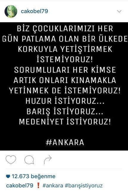 Manken ve sunucu Çağla Şikel ise, şu sözlerle teröre tepki gösterdi: “Biz çocuklarımızı her gün patlama olan bir ülkede korkuyla yetiştirmek istemiyoruz. Sorumluları her kimse artık onları kınamakla yetinmek de istemiyoruz. Huzur istiyoruz, barış istiyoruz, medeniyet istiyoruz.”