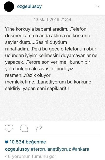 Ünlü manken Özge Ulusoy ise İnstagram hesabından paylaştığı sözlerle terörü lanetledi. Ulusoy, Ankara’daki hain saldırıyla ilgili takipçileriyle şu mesajı paylaştı: “Yine korkuyla babamı aradım. Telefon düşmedi ama o anda aklıma ne korkunç şeyler düştü. Sesini duydum, rahatladım. Peki bu gece o telefonun öbür ucundan iyiyim kelimesini duymayanlar ne yapacak? Teröre bir son verilmeli, bunun bir yolu bulunmalı. Resmen savaşın içindeyiz. Memleketime yazık oluyor. Lanetliyorum bu korkunç saldırıyı yapan cani sapıkları.”