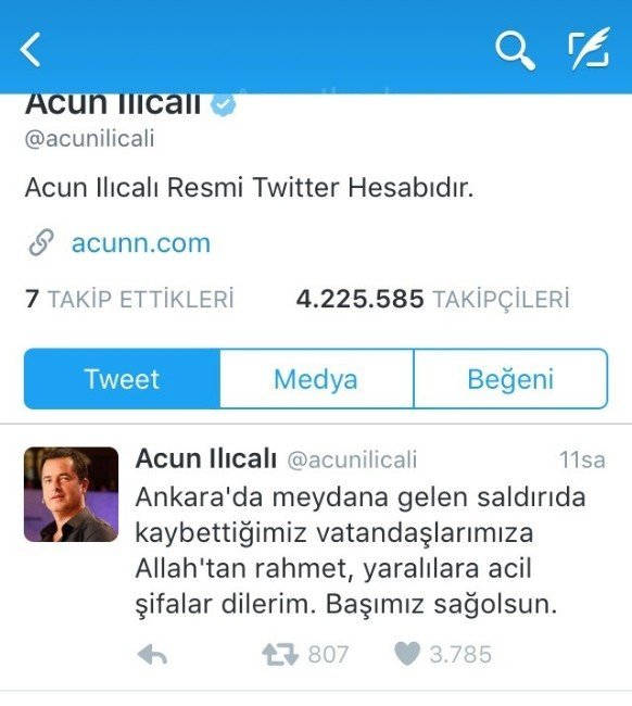 Ünlü televizyoncu Acun Ilıcalı ise Twitter hesabından saldırıda hayatını kaybedenlere rahmet dileyerek, “Ankara’da meydana gelen saldırıda kaybettiğimiz vatandaşlarımıza Allah’tan rahmet, yaralılara acil şifalar dilerim. Başımız sağ olsun” dedi.