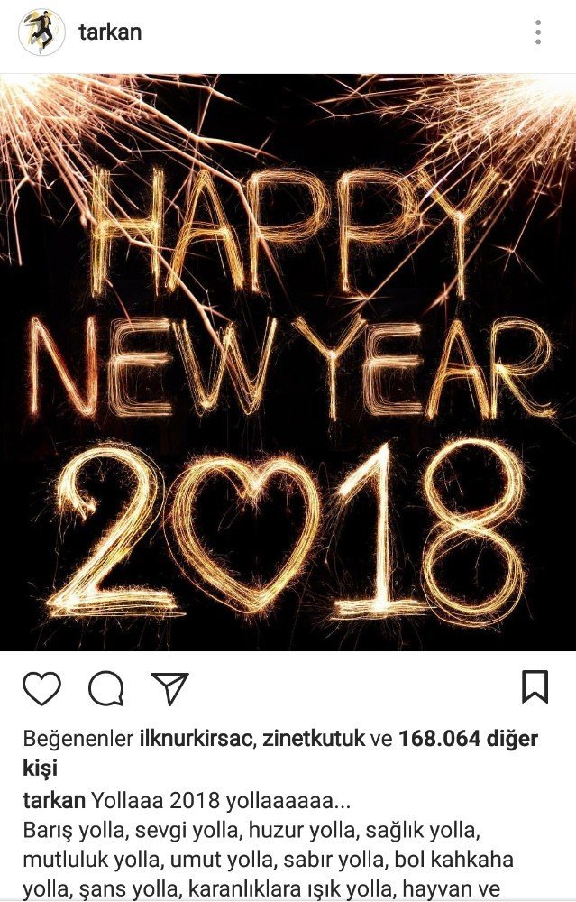 Tarkan,"Yolla 2018 yolla. Barış yolla, sevgi yolla, huzur yolla, sağlık yolla, mutluluk yolla, umut yolla, sabır yolla, bol kahkaha yolla, şans yolla, karanlıklara ışık yolla, hayvan ve doğa sevgisi yolla, vicdan yolla. Aşksız kalplere aşk yolla. Tüm güzellikleri yolla"