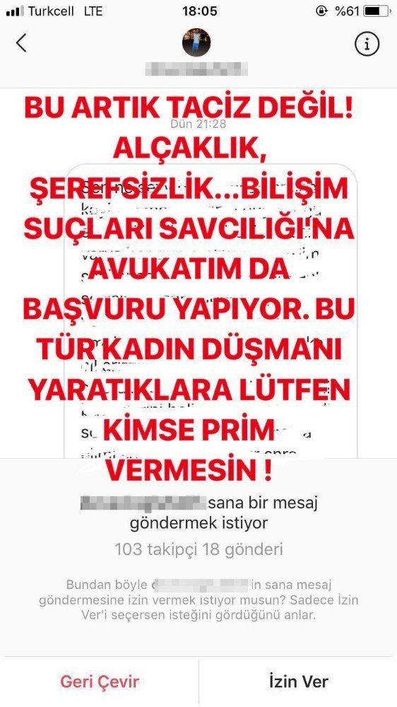Tacizcisini ifşa eden Aral, “Bu artık taciz değil. Şerefsizlik. Bilişim suçları savcılığına avukatım da başvuru yapıyor. Bu Türk Kadın Düşmanı yaratıklara kimse lütfen prim vermesin” şeklinde not düşerek tepkisini dile getirdi.