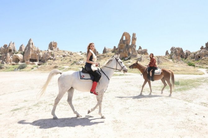 Ünlü mankenler, Kapadokya’da defile yorgunluğunu atlarla attılar
