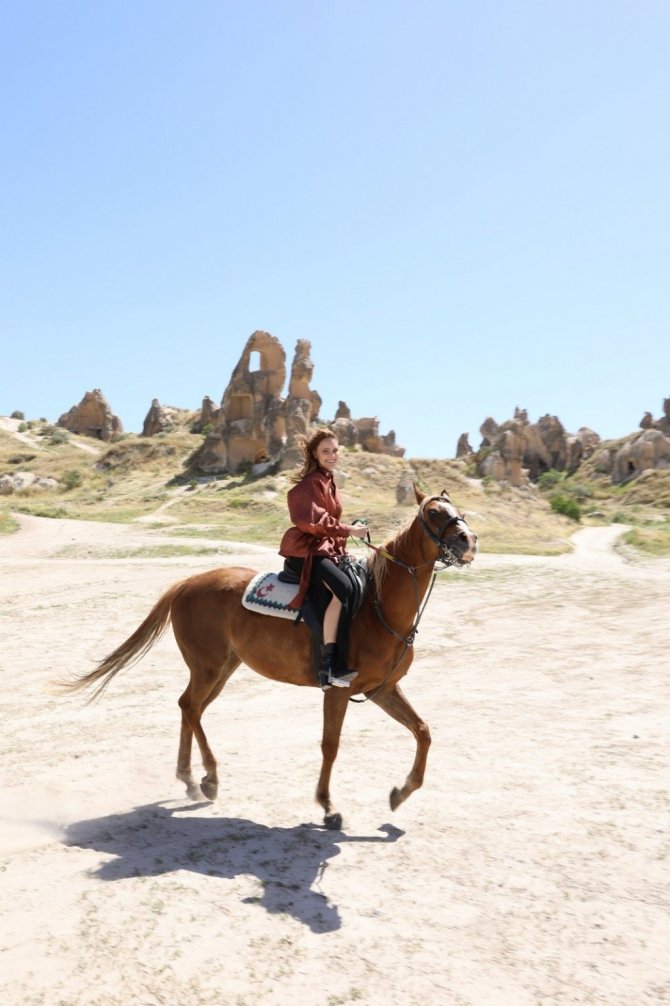"Güzel atlar diyarı" Kapadokya'da olmaktan dolayı çok mutlu olduklarını belirten mankenlerden Özge Ulusoy ve Jessica May ise çekim aralarını fırsata çevirdi. Atlara olan sevgileriyle bilinen Ulusoy ve May, çekimlerde kendilerine eşlik eden atlar ile yakından ilgilendi. Peri bacalarının büyülü atmosferinde başarıyla tamamlanan çekimler sonrasında soluğu atların yanında alan iki manken, at safari yaparak adeta yorgunluk attı.