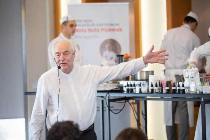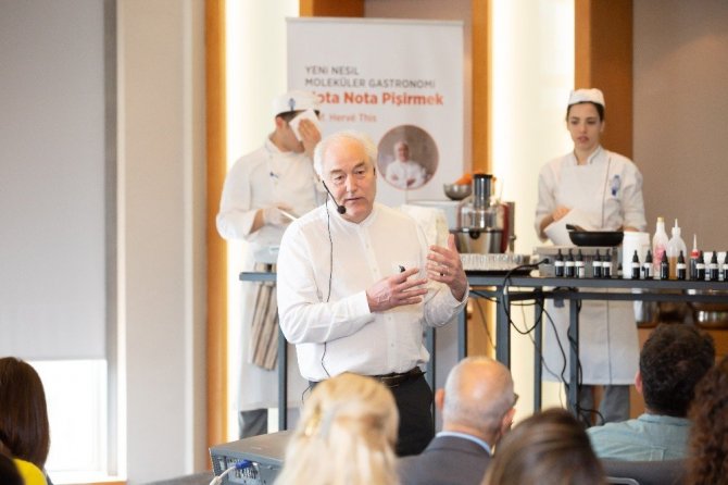Özyeğin Üniversitesi’nin ev sahipliğinde düzenlenen etkinlikte konuşan Prof. Hervé This, moleküler gastronomi olarak tanımlanan bilimsel disiplinin dünya çapındaki üniversitelerde giderek yayıldığının altını çizdi. Hervé This konuşmasında “Dünyada her geçen gün daha fazla laboratuvar ve ekip, kimya, fizik ve biyolojiden yararlanarak mutfak olgusunun farklı mekanizmalarında keşif yolculuğuna çıkmakta. Öte yandan kimya laboratuvarlarındaki modern araçların mutfaklarda kullanılmasıyla ortaya çıkan moleküler pişirme adlı yepyeni bir teknik, dünyayı kasıp kavurmaya başladı: Sifonlar, düşük derecede pişirme, döner buharlaştırıcılar ve ultrasonik sondalar... Bütün bunlar sayesinde yeni bir stil ortaya çıktı; moleküler mutfak. 1994’ten beri ise moleküler gastronominin yeni bir uygulama şekli olarak, dünyanın her yanında yepyeni bir fikir filizlenmekte: ‘Nota Nota Pişirme’. Müzikte sentetik müzik ne ise mutfakta da ‘Nota Nota Pişirme’ odur. Yani saf bileşiklerden bir yemek ortaya çıkarmaktır. Bu teknik akla hayale gelmeyen sonuçlar doğurabilir. Çünkü kıvamdan renge, tattan kokuya, besin içeriğinden toksikliğe kadar yemeğin her unsuru şefin kontrolü altındadır. Ve böylece yepyeni bir mutfak sanatı karşımıza çıkar” dedi.