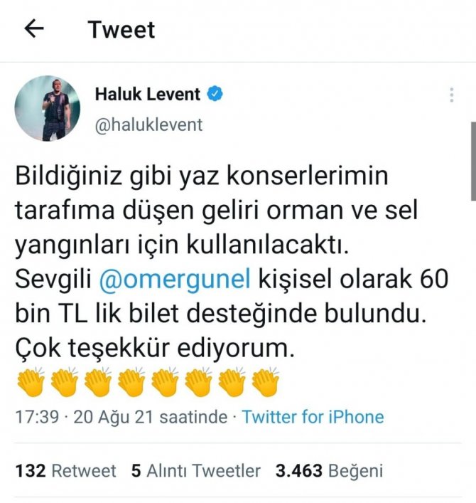 Yaz konserlerinin gelirlerini Türkiye'nin farklı noktalarında çıkan orman yangınları mağdurlarına bağışlayan ünlü müzisyen Haluk Levent'e bir destek...