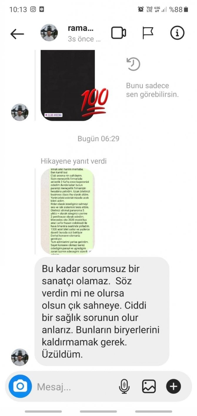 Pandemi sürecinde 22 aydır kapalı olan eğlence mekanlarının kademeli normalleşmenin üçüncü etabı kapsamında yayımlanan yeni genelge ile açılmasının ardından işletmeciler, ünlüler ile konser düzenleme planları yapmaya başladı. Marmaris ilçesindeki Barlar Sokağı'ndaki bir mekan dün açılış için ünlü şarkıcı Irmak Arıcı ile anlaştı. Ancak, iddiaya göre tüm hazırlıkları tamamlanan ve konser için geri sayım yapılan mekanda Arıcı sahneye çıkmadı. Mekanı dolduran ünlü şarkıcının hayranları duruma isyan ederken, işletme sahibi Kamil Issı'da Arıcı'ya tepki gösterdi. Arıcı'nın hayranları işletmenin sosyal medya hesaplarını tepkilerini gösterir mesaj yağmuruna tuttu.