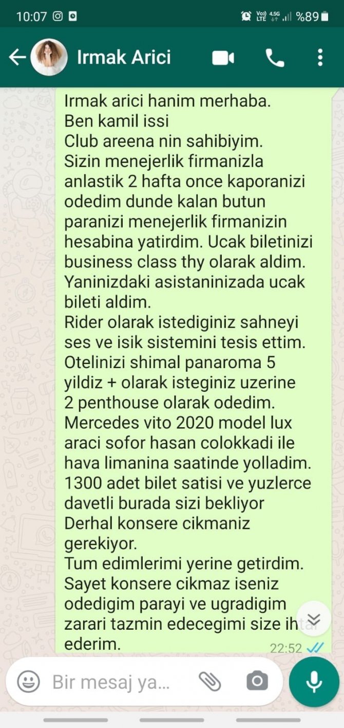 Eğlence mekanı işletmecisi Kamil Issı mesajlaşmaların ekran görüntüsünü sosyal medya hesaplarında paylaşarak, şarkıcının ve asistanının uçak biletini aldığını, konaklamak istediği otelin de ayarlandığını ancak şarkıcının sahne almamasından dolayı mağdur olduğunu belirtti. Konuyu yargıya taşıyacaklarını kaydeden Issı, "Bin 300 kişi Irmak Arıcı konseri için geldi. Ancak hanımefendi konsere hiç bir sebep belirtmeden gelmedi. Hem işletme olarak hem de şahsımın prestiji açısından zor durumda kaldım. Zarar ettik. Konuyu yargıya taşıyacağız" dedi.