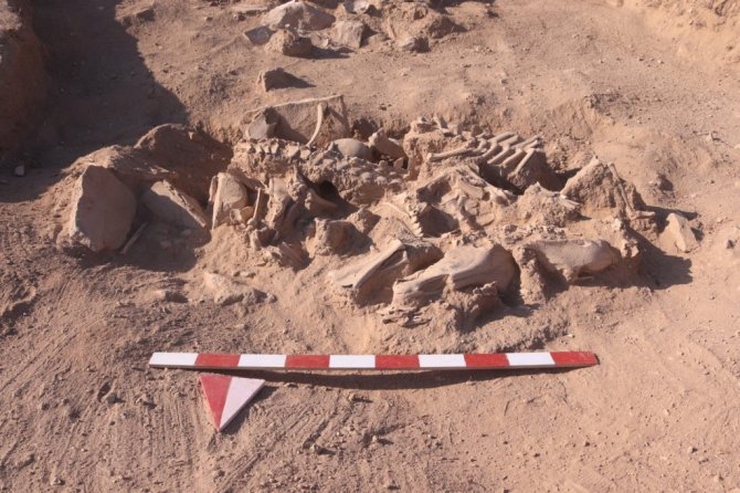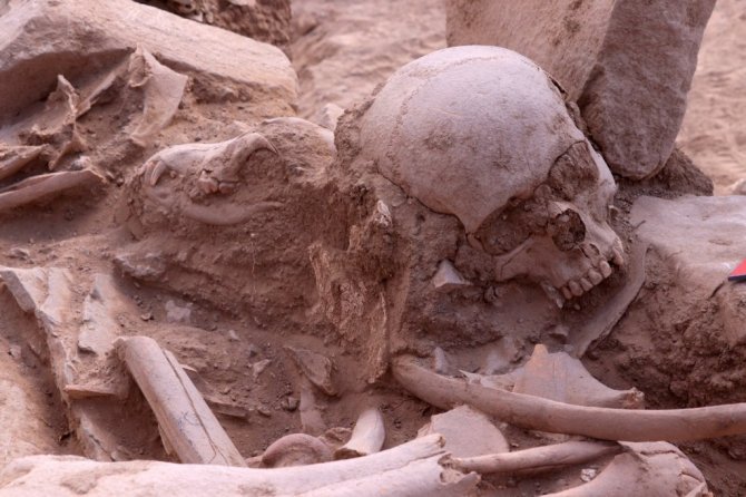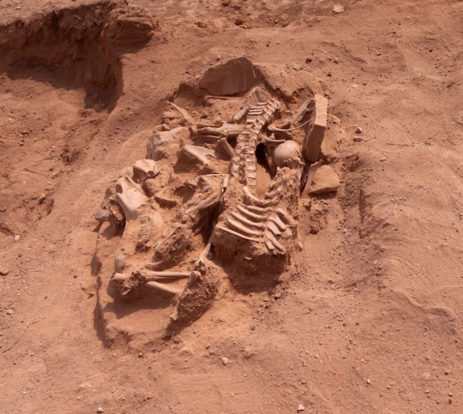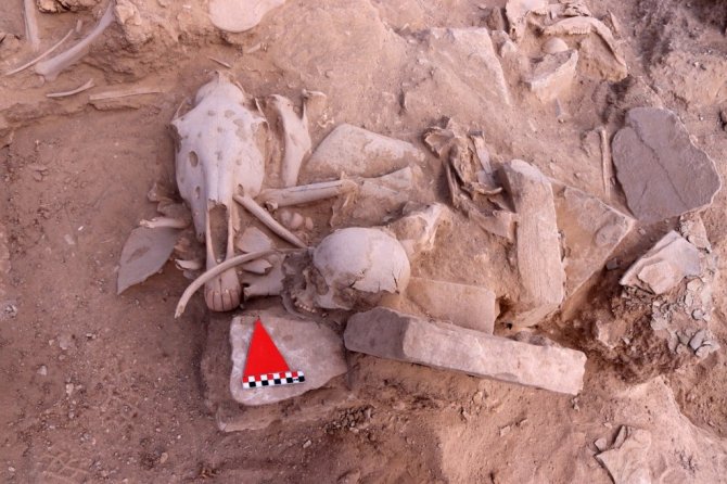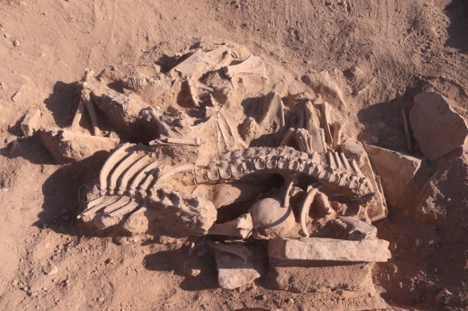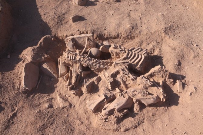 Aynı zamanda bir sığır ve koyunun da çenelerinin kesilerek mezara bırakıldığını tespit ettiklerini ifade eden Çavuşoğlu, "İnsan kemiklerinin parçalara ayrılmış atlarla kapatıldığını görüyoruz. Diğer bir husus ise hemen başının yanında bir köpek başı bulunuyor. Bu da bize atların eskiden kişinin zenginliğini ifade ettiğini gösteriyor. Dört atla birlikte gömülmüş olması, yönetici bir kişi veya askeri bir üst düzey kişi olduğunu bizlere gösteriyor. Burada yapmış olduğumuz çalışmalarda özellikle baş bölgesinde köpeğin yer alması da dikkat çekiyor. Biliyorsunuz köpek ve at sadık birer hayvan. Ölen kişi için atları ve köpeğinin kurban edilmesi de aklımıza geldi. Dinsel bir ritüel bulguyla karşı karşıyayız" diye konuştu.
