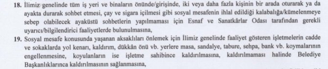 Fiziksel mesafe konusunda yaşanan aksaklıkları önlemek için il genelinde faaliyet gösteren işletmelerin cadde ve sokaklarda yol kenarı, kaldırım, dükkân önü vb. yerlere masa, sandalye, tabure, sehpa, bank vb, koymalarının engellenmesine koyulanların ise işletme sahibince kaldırılmasına, kaldırılmaması halinde Belediye Başkanlıklarınca kaldırılmasının sağlanmasına karar verildi.