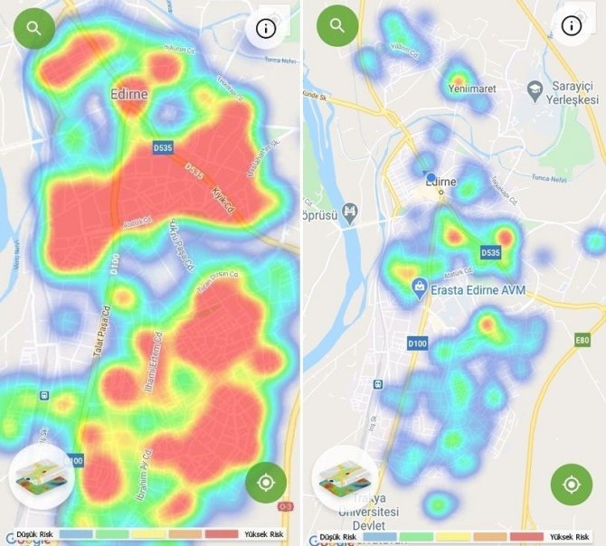 Hayat Eve Sığar (HES) uygulamasında paylaşılan verilere göre, geçen haftalarda yüksek riski temsil eden kırmızı alanların çok sayıda bulunduğu Edirne'de bugünkü görüntüde ise çoğu alanın düşük riski temsil eden mavi renkte olduğu görüldü.