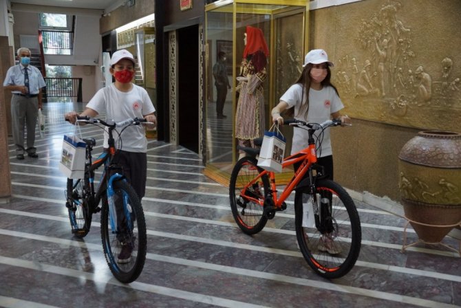 Bisiklet almaya hak kazanan Efeler Ticaret Odası İlkokulu 3'üncü sınıf öğrencisi Ceydanur Uğurlu, sıfır atık projesi kapsamında atık pil ve camları topladıklarını ve bisikleti kazanmayı hak ettiğini dile getirdi.