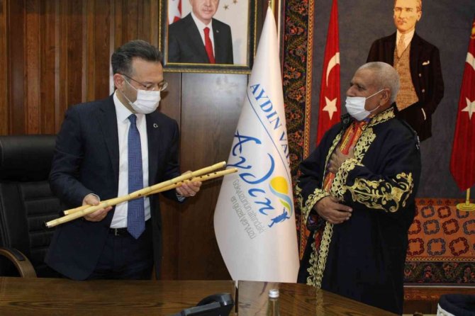 Ziyaret sonunda Dernek Başkanı Besim Acar, Aydın Valisi Hüseyin Aksoy'a el yapımı ney hediye etti.
