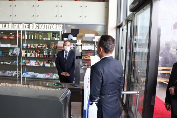 Beraberinde Nazilli Kaymakamı Sedat Sırrı Arısoy ve Belediye Başkanı Kürşat Engin Özcan ile birlikte oda hizmet binası girişindeki görüntülü turnike sisteminden geçtikten sonra binaya giren Vali Aksoy, pandemi ile mücadeleye verdiği katkıdan dolayı yöneticilere teşekkür etti. Valilik ve kaymakamlıklar başta olmak üzere bundan böyle oda, borsa ve diğer STK hizmet binalarına girişlerde HES kodu uygulamasının zorunlu hale geleceğine de dikkat çeken Vali Aksoy, Nazilli Ticaret Odası’na girişlerde ayak ve el dezenfektesi, maske kullanımı ve vücut ateş ölçümleri görüntülü sistemlerle yapılıyor olmasının bölgeye örnek olduğunu da ifade etti.