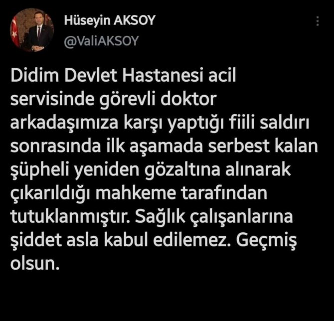 Saldırganın tutuklandığını açıklayan Aydın Valisi Hüseyin Aksoy ise sağlık çalışanlarına uygulanan şiddetin asla kabul edilmediğine dikkat çekerek "Didim Devlet Hastanesi acil servisinde görevli doktor arkadaşımıza karşı yaptığı fiili saldırı sonrasında ilk aşamada serbest kalan şüpheli yeniden gözaltına alınarak çıkarıldığı mahkeme tarafından tutuklanmıştır. Sağlık çalışanlarına şiddet asla kabul edilemez. Geçmiş olsun" dedi.