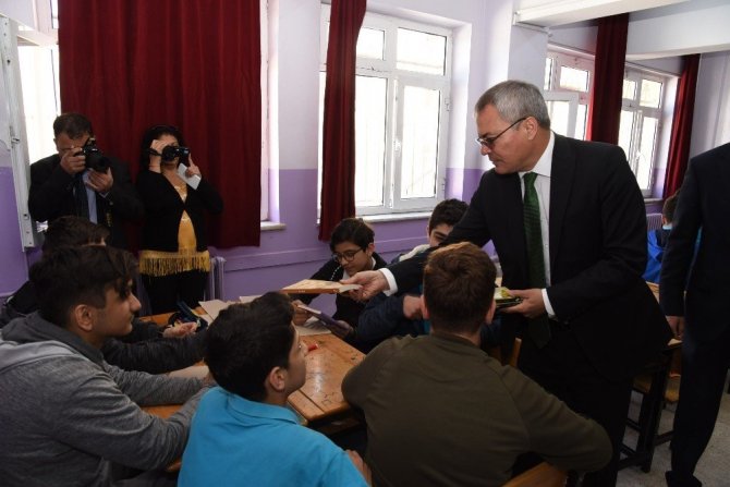 Okul yönetimi ve öğretmenlerle toplantı yapan Vali Deniz, sınıfları da ziyaret ederek öğrenci ve öğretmenlere kitap hediye etti.