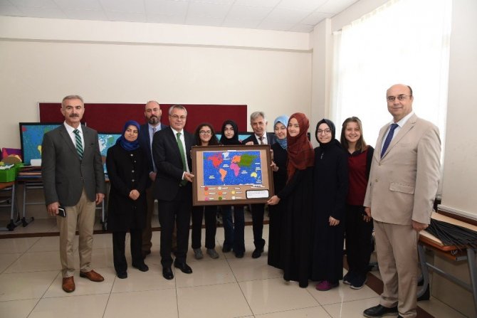Ziyarette Vali Deniz’e Şehit Fatih Kalu Kız İmam Hatip Lisesi öğrencileri tarafından hazırlanan Dokunsal Dünya Haritası ve Vali Ahmet Deniz için yaptıkları resim hediye edildi.