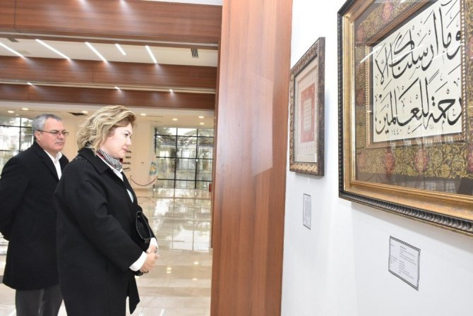 Manisa Celal Bayar Üniversitesi Fen-Edebiyat Fakültesi Anabilim Dalı Öğretim Görevlisi Mehmet Veysi Dörtbudak’ın eşlik ettiği Vali Ahmet Deniz ve eşi Olcay Deniz’e sergi ziyaretinde Tezhip sanatçısı Suna Ongan, eserler hakkında bilgi verdi.