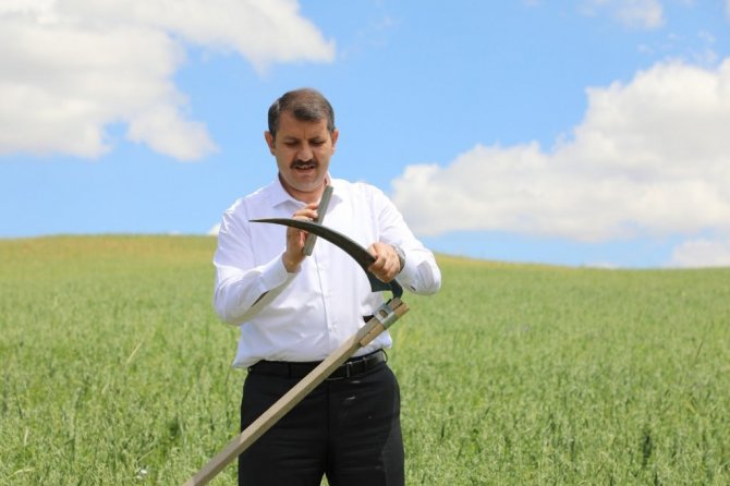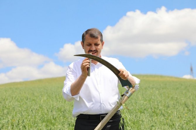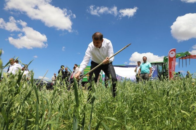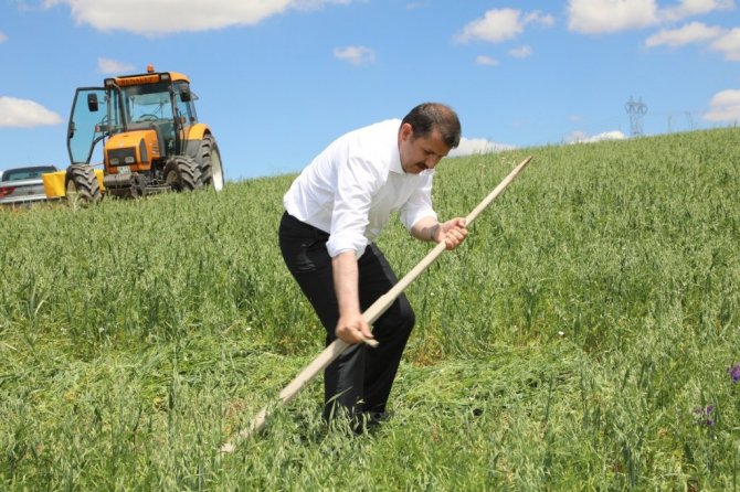 Sivas Valisi Salih Ayhan kolları sıvayıp girdiği tarlada traktör sürdü, tırpanı eline alıp yem bitkisi hasat etti.