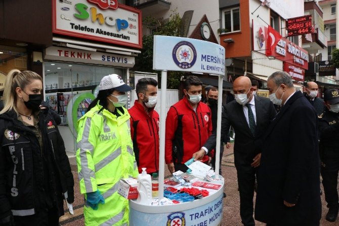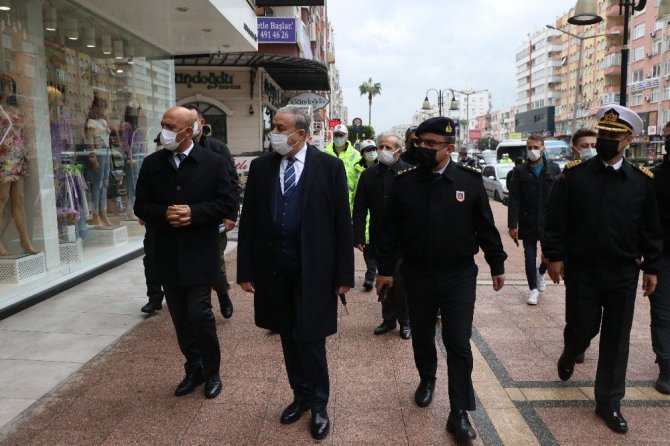 Turuncu kategoride yüksek riskli iller arasında yer alan Mersin'de yeni dönemin başlamasıyla birlikte korona virüs denetimleri de sürüyor. İçişleri Bakanlığının genelgesi doğrultusun bu haftada 81 ilde gerçekleştirilen Covid-19 denetimlerinin Mersin ayağı, Vali Ali İnsan Su başkanlığında, kentin en işlek caddelerinden biri olan GMK Bulvarı üzerinde gerçekleştirildi. Denetimlerde Vali Su'ya, İl Jandarma Komutanı Albay Necip Çarıkcıoğlu, Sahil Güvenlik Akdeniz Bölge Komutanı Albay Oğuz Bavbek ile İl Emniyet Müdürü Mehmet Şahne eşlik etti. Cadde üzerinde özellikle lokantaları denetleyen Vali Su, lokantalardaki masa düzeni, alınan hijyen önlemleri ve uyarı yazıları üzerinde durdu. Lokanta işletmecilerine, kurallara uymaları konusunda uyarılarda bulunan Vali Su, kurallara uyulduğunu görmekten duyduğu memnuniyeti dile getirdi. Vali Su, toplu taşıma araçlarına da binerek hem şoförleri hem de vatandaşları kurallara uymaları konusunda uyarılarda bulundu.