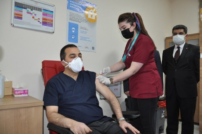 Kars Valisi Türker Öksüz'e, Korona virüs (Kovid-19) aşısının ilk dozu yapıldı.