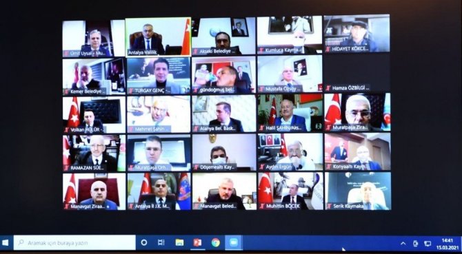 Valilik Toplantı Salonunda Video Konferans Yöntemiyle gerçekleştirilen pandemi değerlendirme toplantısına Vali Ersin Yazıcı, Antalya Büyükşehir Belediye Başkanı Muhittin Böcek, Vali Yrd. Nurettin Ateş, ilçe kaymakamları ve ilçe belediye başkanları, İl Sağlık Müdürü Dr. Ünal Hülür, Antalya Esnaf ve Sanatkârlar Odaları Birliği (AESOB) Başkanı Adlıhan Dere, Antalya Ticaret ve Sanayi Odası (ATSO) Başkanı Davut Çetin ve sivil toplum kuruluşları yöneticileri katıldı.