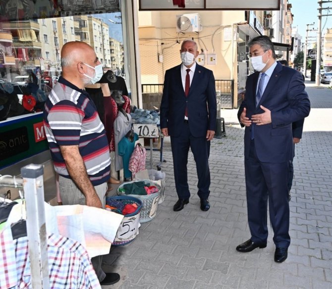 Belediye Başkan Yardımcısı Mehmet Hulusi Akkuş, İl Sağlık Müdürü Dr. Hasan Öznavruz ve 112 Acil Çağrı Merkezi Müdürü Guddusi Arık ile Akyar Caddesi'ndeki denetimlere katılan Vali Erdinç Yılmaz, esnaf ve vatandaşlardan korona virüs bitene kadar tedbirlere uyulmasını istedi.