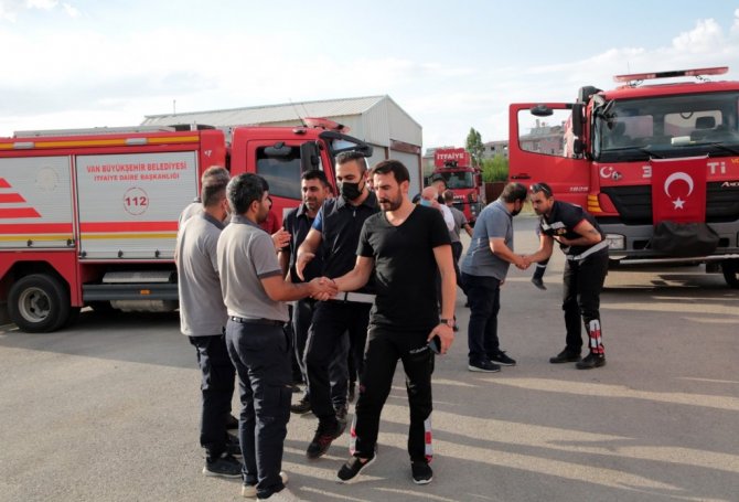 Akşam saatlerinde Tuşba ilçesinde bulunan İtfaiye Daire Başkanlığı Kampüsünde çıkış yapan itfaiye ve VASKİ personelleri, arkadaşlarıyla tek tek vedalaştı. Yangın bölgesinde görev alacak olan arkadaşlarının arkasından itfaiye hortumuyla su döken meslektaşları, kazasız bir şekilde gidip dönmeleri için dua etti.