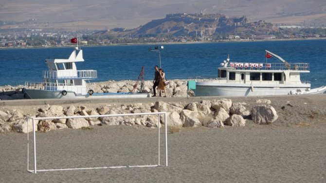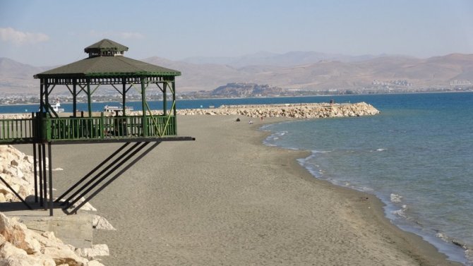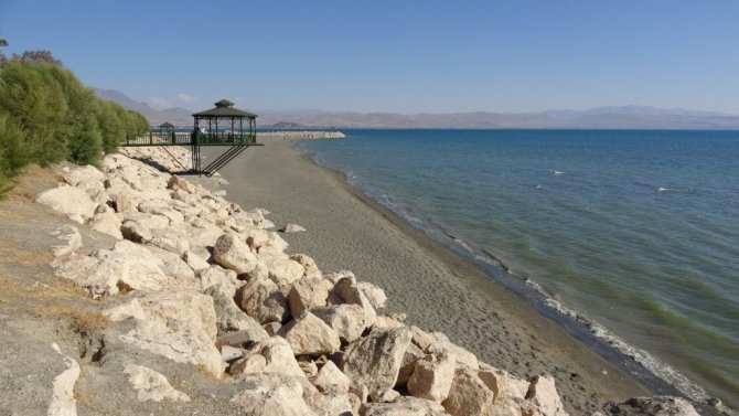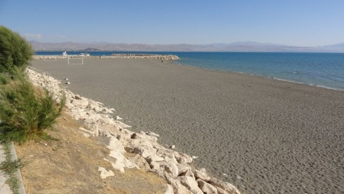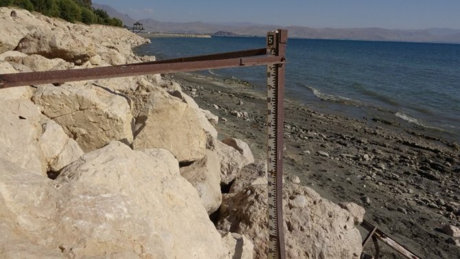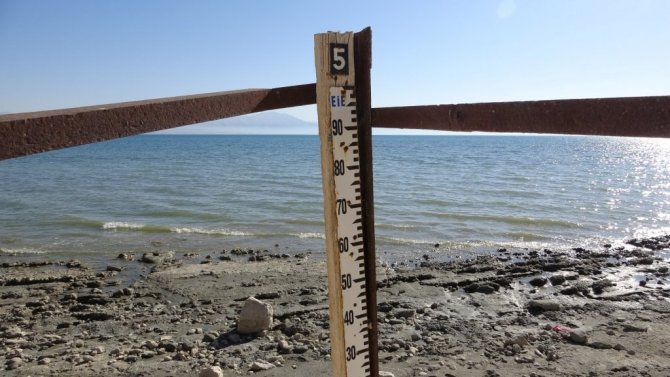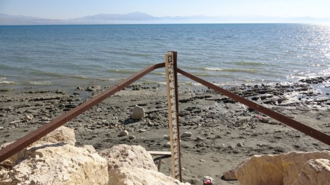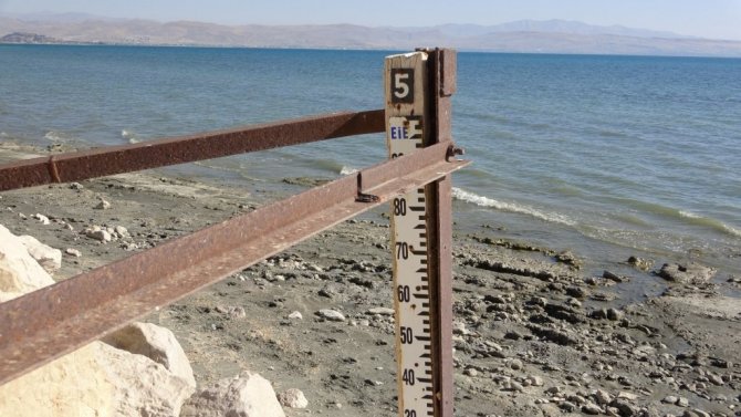 Dünyanın en büyük sodalı gölü olan Van Gölü, küresel iklim değişikliğinin etkisiyle büyük ölçüde su kaybı yaşarken, kıyıdaki ölçü direği karada kaldı.