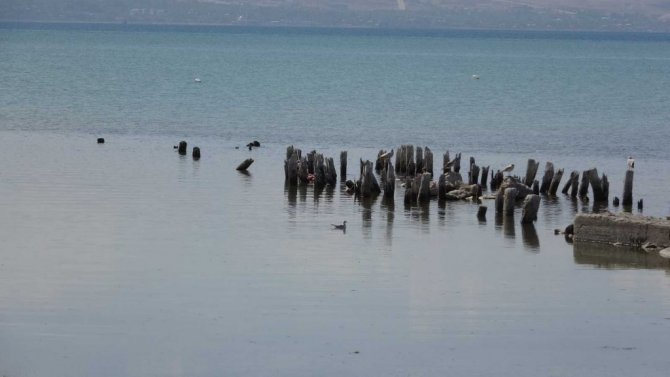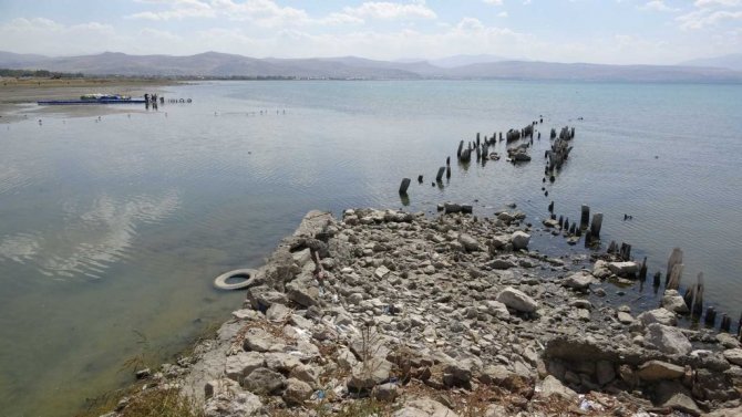 Van Gölü’nde suyun çekilmesi ile yüz yıllık iskele ortaya çıktı