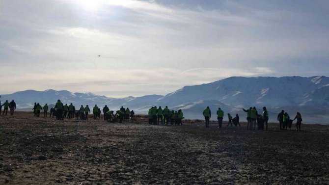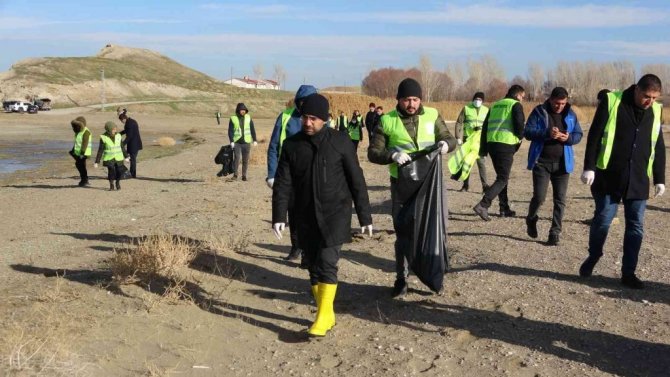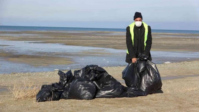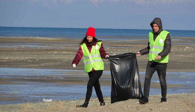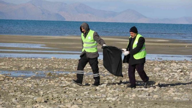 Dünyanın en büyük sodalı gölü olan Van Gölü'nde küresel iklim değişikliğinin etkisiyle suların çekilmesi sonucu ortaya çıkan çöpler temizlendi.