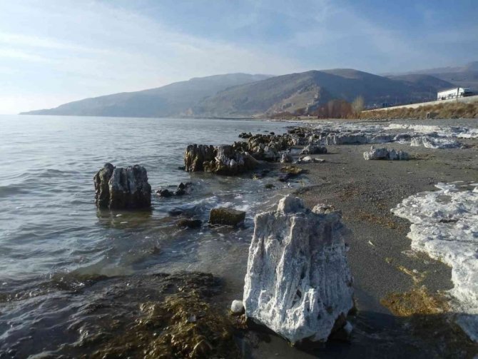 Bitlis'in Adilcevaz ilçesinde Van Gölü'nün çekilmesiyle mikrobiyalitler ortaya çıkmaya başladı.