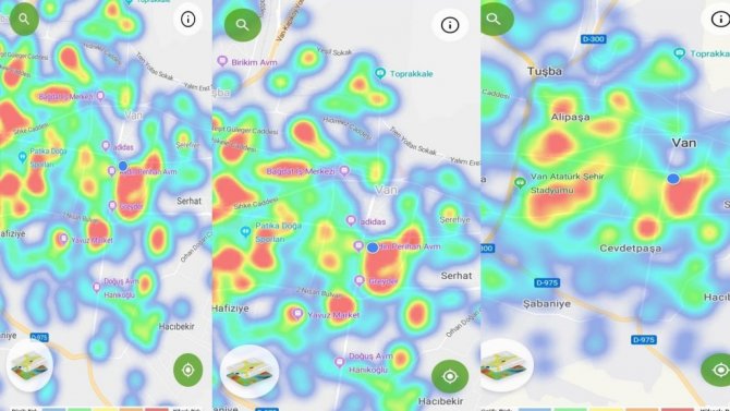 Sağlık Bakanlığı'nın "Hayat Eve Sığar" uygulamasında Van'daki korona virüs tablosu ise mavi renkten, kırmızı renge dönüşmeye başladı. Ülke geneli olduğu gibi Van'da da Bakanlığın riskli bölgeleri gösteren haritada hasta sayısının ve yayılımın arttığı dikkat çekerken, il merkezindeki kırmızı nokta sayısının da devam ettiği görüldü.