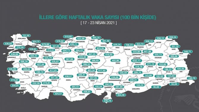 Sağlık Bakanı Dr. Fahrettin Koca'nın açıkladığı, illerde her 100 bin kişide görülen korona virüs güncel vaka sayıları raporuna göre Van en az riskli...