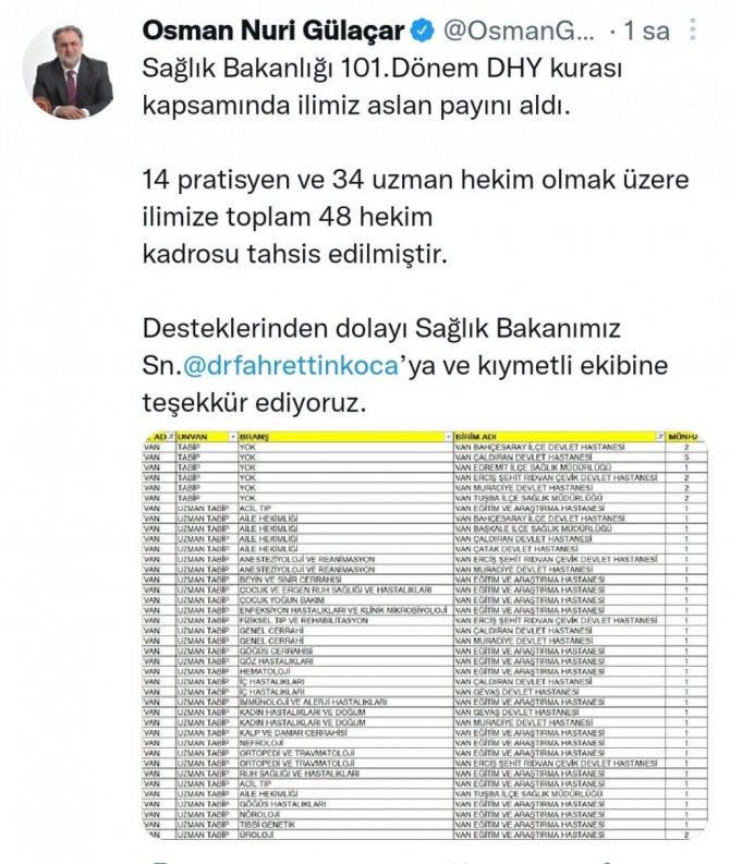 Sağlık Bakanlığı 101. dönem Devlet Hizmeti Yükümlülüğü (DHY) kurası kapsamında Van'a 48 yeni doktor atandı. Konuyla ilgili sosyal medya hesabından açıklama yapan Ak Parti Van Milletvekili Gülaçar; "Sağlık Bakanlığı 101. dönem DHY kurası kapsamında ilimiz aslan payını aldı. 14 pratisyen ve 34 uzman hekim olmak üzere ilimize toplam 48 hekim kadrosu tahsis edilmiştir. Desteklerinden dolayı Sağlık Bakanımız Sn.@drfahrettinkoca'ya ve kıymetli ekibine teşekkür ediyoruz. Vanlıların uzun zamandır beklediği çocuk hastalıkları ile ilgili olan uzmanlıklarda bu atama yer aldı" ifadelerine yer vrdi.
