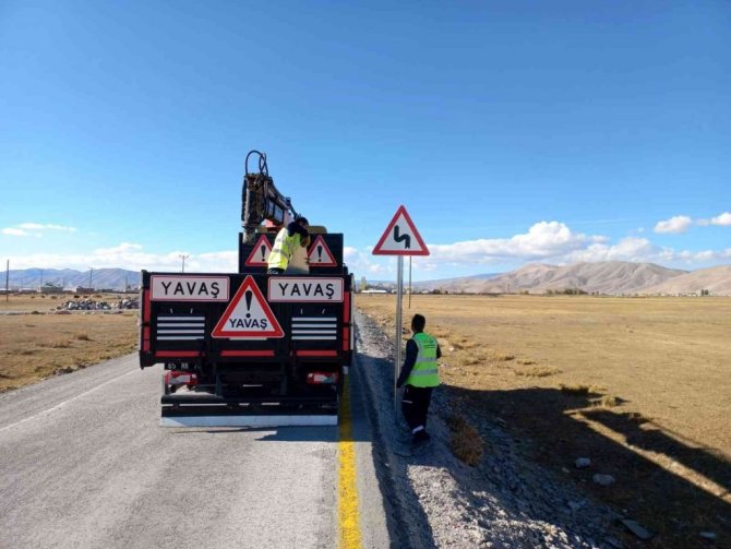 Van’da yenilenen yollarda çizgi ve uyarıcı levha çalışması