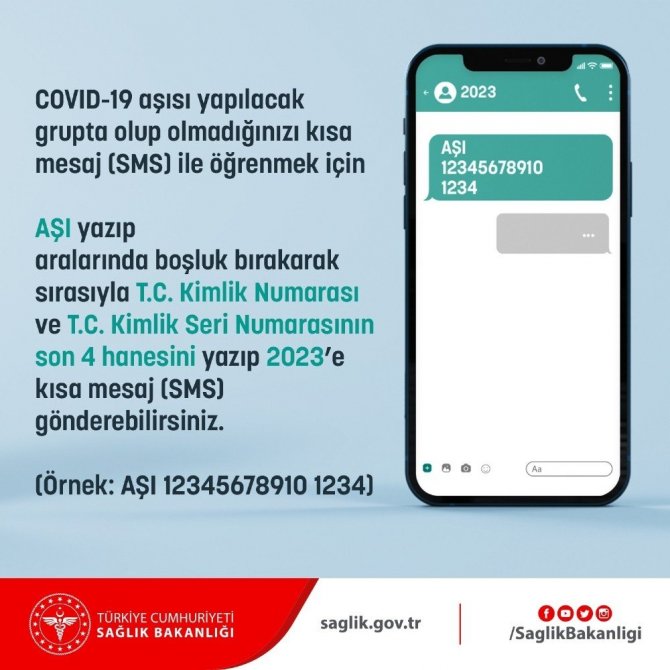 Covid-19 aşısı olacak vatandaşlar, uygulama marketleri üzerinden indirerek veya internet sayfasından e-Nabız'a giriş yaptıktan sonra aşılama gruplarında yer alıp almadıklarını öğrenebilecek. İnternet erişimi olmayan vatandaşlar ise aşı yapılacak grupta olup olmadığını kısa mesaj (SMS) ile öğrenmek için "AŞI" yazıp aralarında boşluk bırakarak sırasıyla T.C. kimlik numarası ve T.C. kimlik seri numarasının son 4 hanesini yazıp "2023"e kısa mesaj (SMS) gönderebilecek. (Örnek: AŞI 12345678910 1234)
