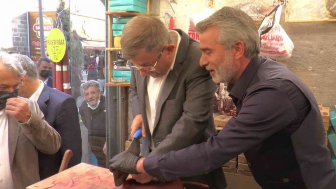 Cumhuriyet Meydanı'nda bulunan Kapalı Çarşı'da esnaf ziyaret eden Davutoğlu, daha sonra pastırma kesti.
