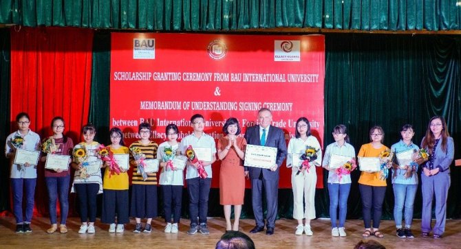 Vietnam’da bin 350 öğrencinin katıldığı bursluluk sınavında başarı gösteren öğrencilere ödülleri, Vietnam’ın en iyi ilk 3 üniversitesinden biri olan Foreign Trade Universitesi (Dış Ticaret Üniversitesi) Rektörlüğü’nde düzenlenen bir törenle verildi. Burs almaya hak kazanan 300 öğrenci, lise müdürleri ve velilerin katıldığı törenle, yüzde 25, yüzde 50 ve yüzde 100 bursluluk belgelerini aldı. BAU Global Bursluluk Sınavı programına BAU Mütevelli Heyeti Başkanı Enver Yücel, BAU International University Rektörü Dr. Sinem Vatanartıran, BAU Global CEO’su Ahmet Köse, Vietnam Eğitim Bakanı Müsteşarı Dr. Ha Huu Phuc, FTU Üniversitesi Rektörü Dr. Bui Anh Tuan ve çok sayıda veli katıldı.